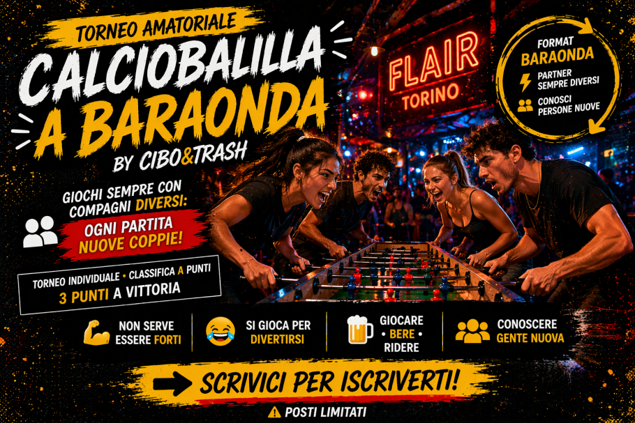Se stai cercando un modo divertente per conoscere nuove persone a Torino, il torneo di calciobalilla a baraonda firmato Cibo & Trash è quello che fa per te! 🎉
