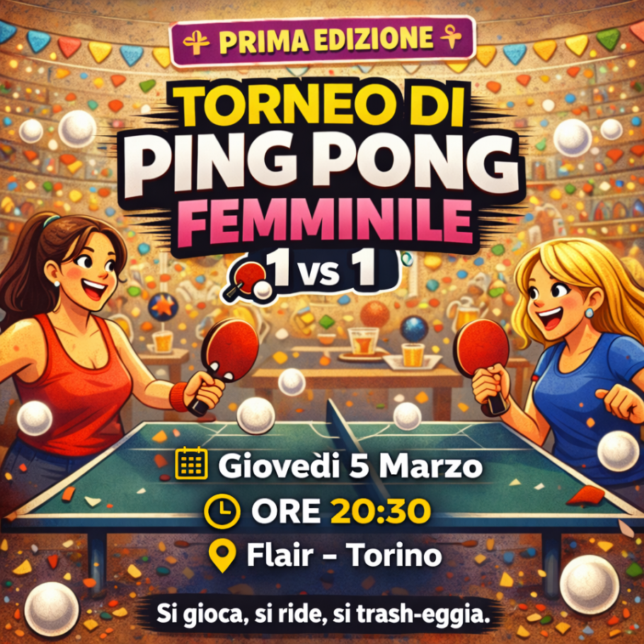 Cibo & Trash lancia la prima edizione del Torneo Ping Pong Femminile 1vs1 a Torino, una serata pensata per divertirsi, conoscere nuove persone e vivere lo sport in modo leggero e coinvolgente.